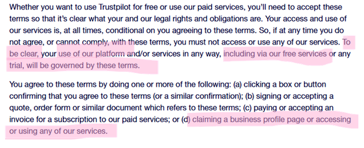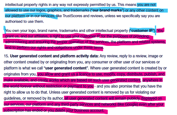 - Worse still, Trustpilot claims a “time-, location-, and content-unlimited right of use” over a business’s intellectual property, effectively giving itself free rein to exploit that content for commercial purposes, indefinitely.