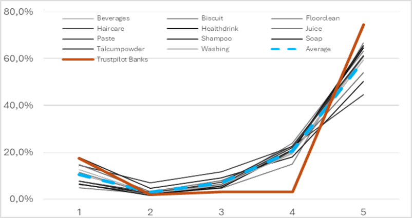 This becomes evident when analyzing entire sectors, take banking, for example. The number of reviews per company is highly suspicious. Small, unknown firms often have 20,000 reviews or more, sometimes even exceeding the number of customers they claim to serve. Meanwhile, well-established institutions struggle to reach a few hundred reviews.